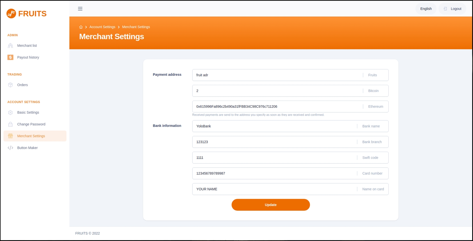 Set up payment addresses (the buyer's successful transaction amount will be transferred to the merchant's billing address), including: